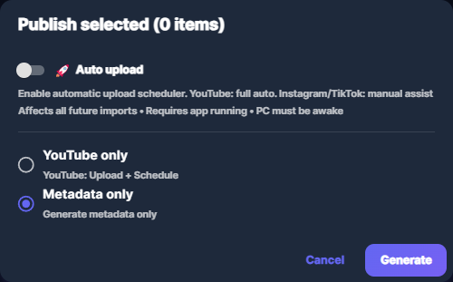 Select the row(s). Then either: in the Details panel click Generate in the Metadata section (for the selected row; you can choose to generate for all platforms or only for missing ones), or click Publish, choose Metadata only, then Generate (for all selected rows). Only rows that need metadata for the chosen platforms are sent; the rest are skipped and you see a message.