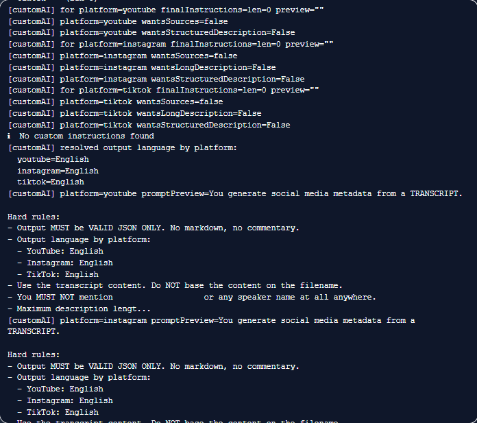 outputs/Transcripts/{stem}.txt. Skipped if a transcript file already exists and is non-empty; otherwise the existing file is used. If the transcript is too short (e.g. under 40 characters), the pipeline stops with an error for that video. - Metadata — Generates title, description, and hashtags with OpenAI using your Custom AI settings (loaded from app user data). Writes