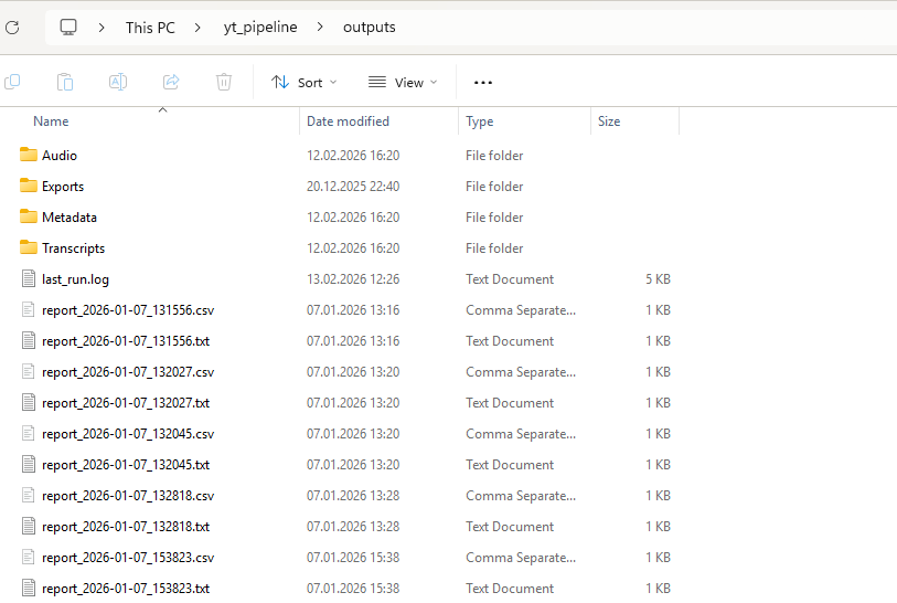When the run finishes, outputs are in yt_pipeline/outputs: Audio, Transcripts, Metadata, and Exports/YouTube, Exports/Instagram, Exports/TikTok. Run reports and logs are written to yt_pipeline/outputs/Reports/ (e.g. last_run.log, report_*.txt, report_*.csv). Use Open outputs or Open exports in the Details panel to open these folders.