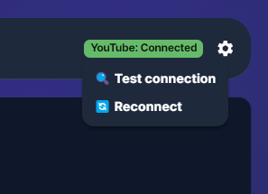 Use Test connection and Reconnect from the YouTube chip in the command bar (click the YouTube status) to verify credentials.